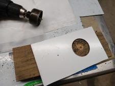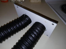 The Mustang defrost duct that came with the kit is not going to fit. Since I'm not using the center dash vent a 4.5 in. x 8 in. eighth inch thick plastic with two holes for the flex hoses to pass through makes an adapter to use the Maverick nozzle. Bailing wire secures the duct to the plate. The plate is attached to the defrost nozzle flange with #10-32 bolts and lock nuts. If using a center vent a lot smaller defrost nozzle will need to be fabricated.