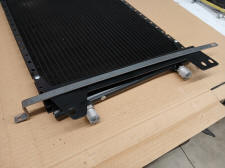 The condenser mounting brackets was installed on the front of the condenser instead of the back. 1/2 in. X 1/8 in. flat bar was bent to mimic the factory condenser mount and then fastened to the Mustang mounting bracket. The top corners of the Mustang brackets were trimmed to allow the condenser to ride higher in the radiator support opening to catch more air. The dryer was relocated lower on the condenser to allow room for the hood prop rod.