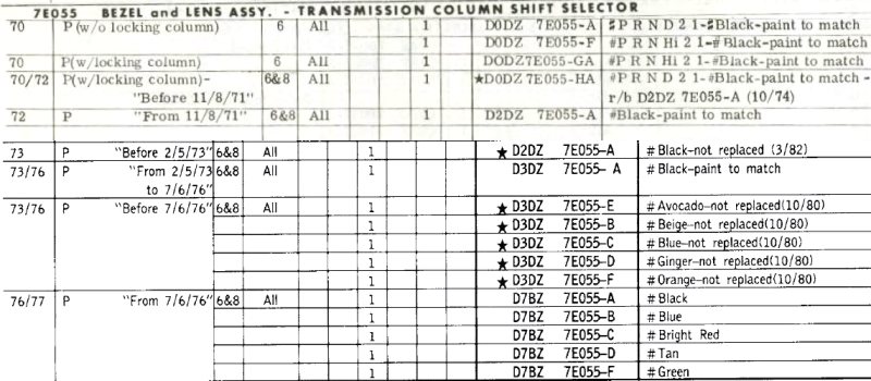 The selector Bezel mounting tabs are closer together on the early '70 for the skinny column. The last letter in the part number specifies the color.