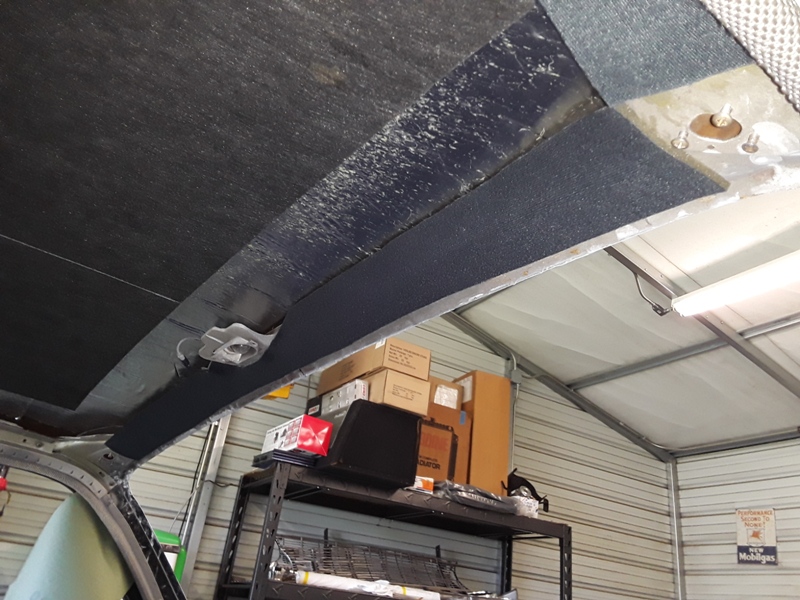 A layer of Peel and Seal was used for sound deadener before the insulation was glued to the roof. A couple old fan belts were cut to be used as a substitute for the welt. The welt is clipped to the body and the windlace is stapled to the welt. The factory clips hold the fan belt welt in place. Insulation was added to the C pillow and strips of new car headliner foam was glued around the perimeter of the roof to protect the headliner from any burr or sharp edges that it could snag.