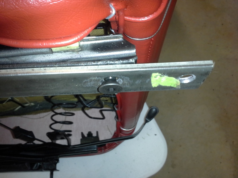Once I installed the front seats I found myself sitting closer to the steering wheel. I needed to come up with a way move the seat back without modifying the seat or floor. I made seat track extensions out of 1 1/4 in. x 3/16 in. flat stock to go between the seat tracks and floor pan to move the seats back another 2 inches. The holes in the track extensions were countersunk and flat head bolts were used fasten the seat to the tracks and floor. The extensions were painted to prevent rust stains on the carpet. For more detail on making seat track extensions "click here".