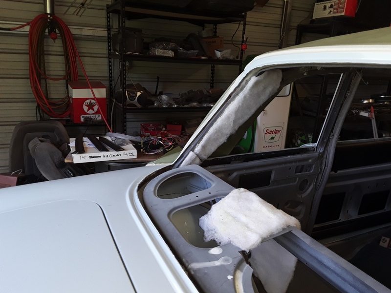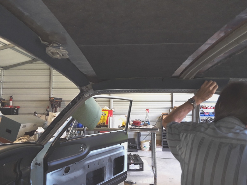 A layer of Peel and Seal was used for sound deadener before the insulation was glued to the roof. A couple old fan belts were cut to be used as a substitute for the welt. The welt is clipped to the body and the windlace is stapled to the welt. The factory clips hold the fan belt welt in place. Insulation was added to the C pillow and strips of new car headliner foam was glued around the perimeter of the roof to protect the headliner from any burr or sharp edges that it could snag.