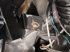 The Mustang defrost duct that came with the kit is not going to fit. Since I'm not using the center dash vent a 4.5 in. x 8 in. eighth inch thick plastic with two holes for the flex hoses to pass through makes an adapter to use the Maverick nozzle. Bailing wire secures the duct to the plate. The plate is attached to the defrost nozzle flange with #10-32 bolts and lock nuts. If using a center vent a lot smaller defrost nozzle will need to be fabricated.