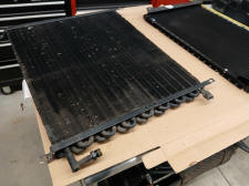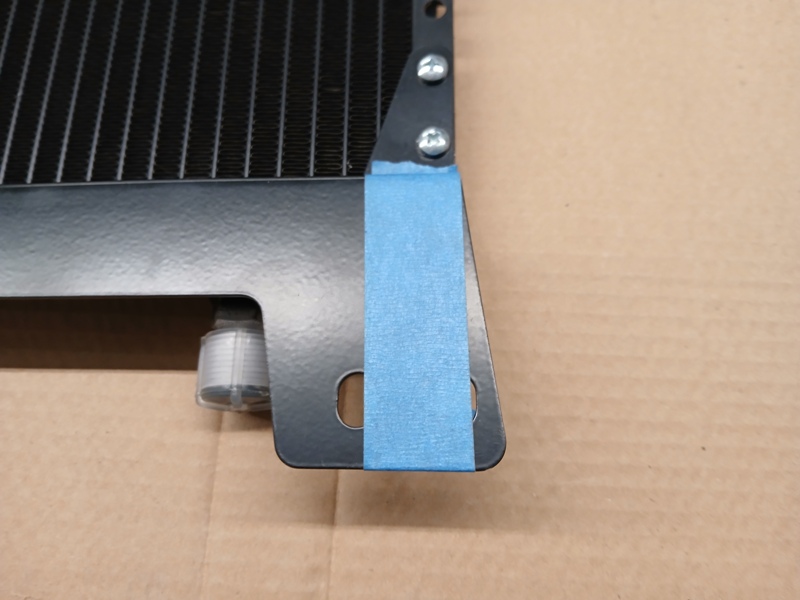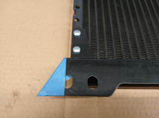 The condenser mounting brackets was installed on the front of the condenser instead of the back. 1/2 in. X 1/8 in. flat bar was bent to mimic the factory condenser mount and then fastened to the Mustang mounting bracket. The top corners of the Mustang brackets were trimmed to allow the condenser to ride higher in the radiator support opening to catch more air. The dryer was relocated lower on the condenser to allow room for the hood prop rod.