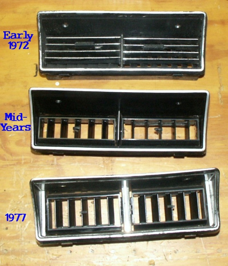 The main difference in the dash board is the lower corners. The early dash has rounded corners and the later dash with glove box has squared corners. The hole for the wiper and headlight switch bezel are larger on the later glove box models. Also the support brace behind the cluster was different on the '73-'77 models. The AC vent in the center of dash changed three times during the production run.