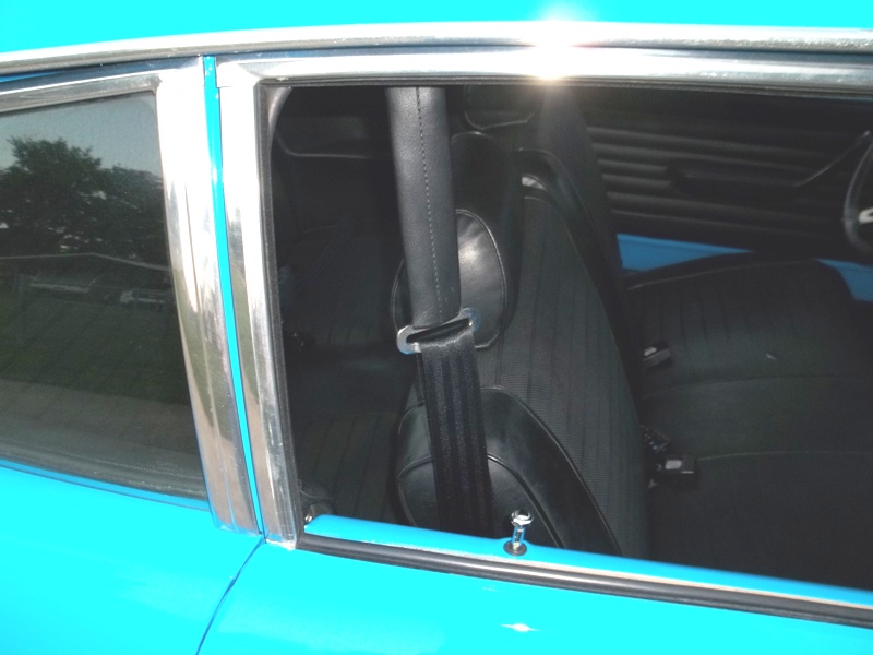 The shoulder strap anchor bolt is in the front of the B-post on the '74 and rear of the B-post on the '73. The '74 also has an extension.